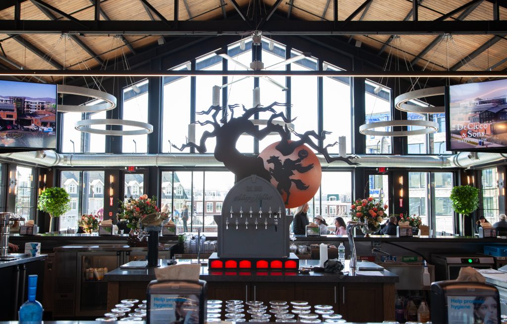 Chris DeCicco dreamed of decorating the second floor pub area with memorabilia from the 1999 film Sleepy Hollow. He spent years searching eBay for costumes which are on display. Other spooky touches: coat hangers and the bar’s beer tap that feature a silhouette of the Headless Horseman. Also unique to this location is The Hollows, a pub kitchen that serves up smash burgers, pizzas, and a Calabrian Chili Chicken Sandwich, which Chris says is his personal fave.